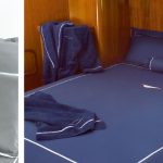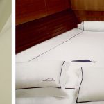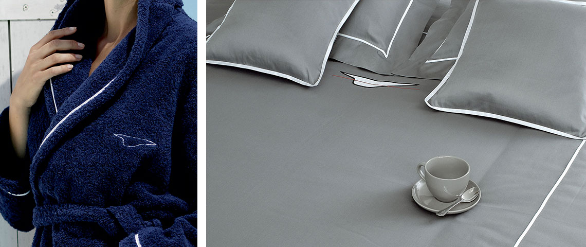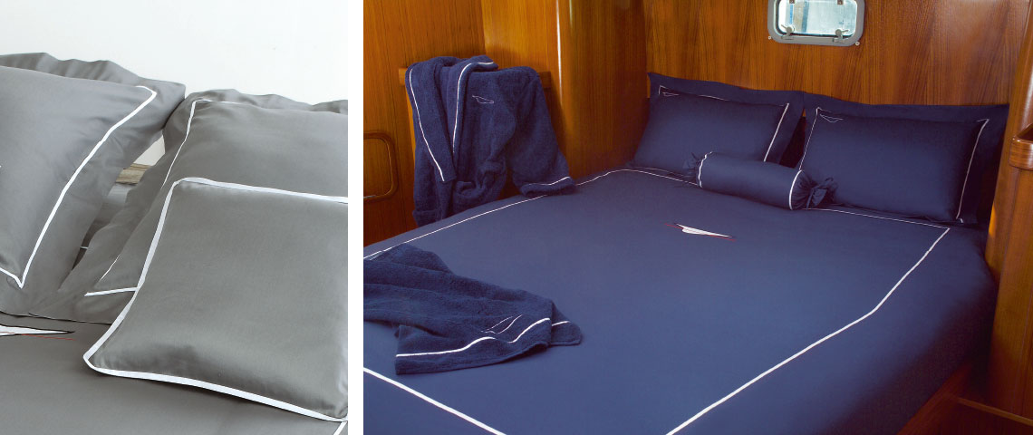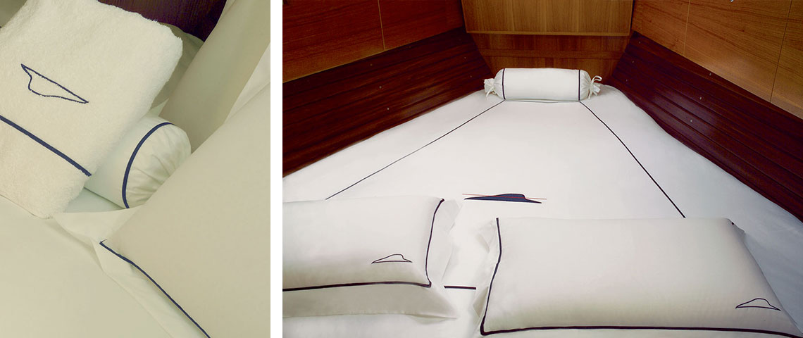 This luxury yacht-type linen bears the embroidered design of a hull with a red waterline. Comes in a wide choice of colors