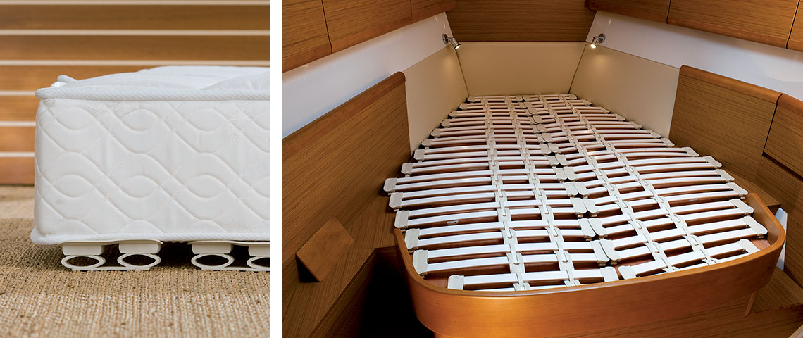 Extra flat, it slides under existing mattresses for added ventilation. Twin laminated beech slats and the articulated moldings provide maximum flexibility and comfort and enable Victoria Flex to adapt perfectly to the contours of your body. Victoria Flex can be rolled up to provide easy access to stowaway lockers.