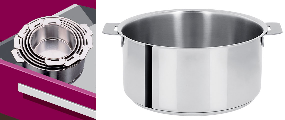 The removable-handle concept enables perfect stacking of the pots and pans for significant space savings in your cupboards and dishwasher.
